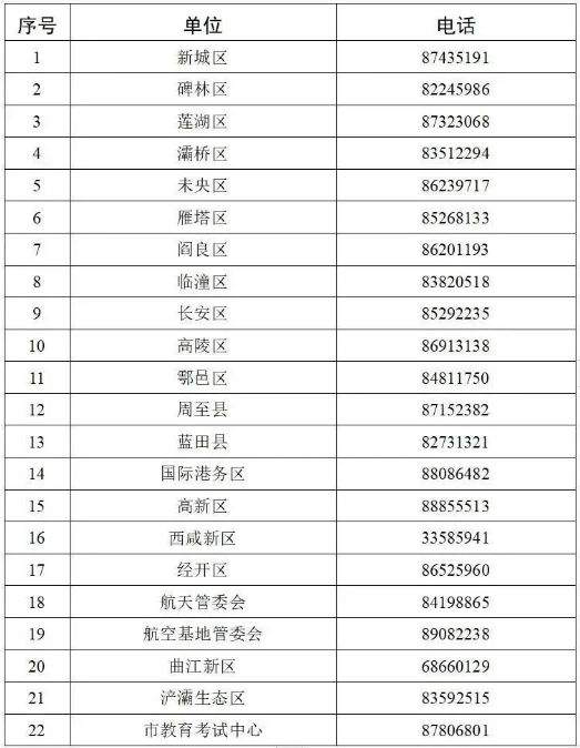陕西省西安市各区县、各开发区初中学业水平考试咨询电话
